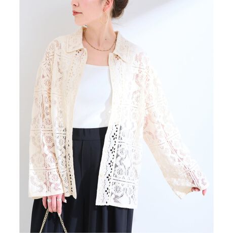 スクエアに囲まれたお花モチーフが連続するデザインで、甘くなりすぎず上品な印象です。前立て部分には、コットンベースにアイレット刺繍を施した別生地を切り替え、襟もレース生地で統一し、全体にまとまりのあるデザイン。裾脇にはサイドスリット入りで、抜け感と動きやすさがあり軽い羽織りとしても活躍します。