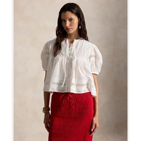 超軽量のコットンボイルを使用したトップス。ヨークに施したピンタックでシェイプし、光沢のあるボタンとロマンティックなレーストリムのディテールをあしらったリラックスフィットのAラインシルエットが特徴・リラックス感のあるAラインのシルエット / 腰丈・セルフタイのリボンが付いたラウンドネック / ボタンとループ留めの前立て / シェルボタン・シャーリング入りの半袖のパフスリーブ / ボタン付きカフスの上にピンタックとはめ込みのレーストリム・フロントとバックヨークにピンタック・裾の上にピンタックとはめ込みのレーストリム・モデル身長178cm、着用サイズS 【素材】・本体:綿 100% 装飾部分を除く【生産国】インド