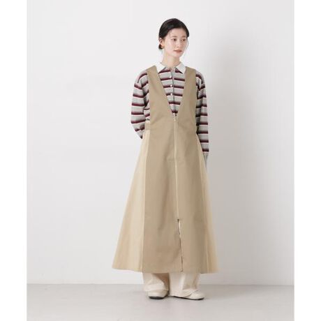 深めのVネックとAラインシルエットが特徴のジャンパースカート。ワークディテールを女性らしく着こなせるデザインに落とし込み、こなれた雰囲気に仕上げたデザイン。インナー次第でシーズンを問わず幅広いコーディネートを楽しめます。