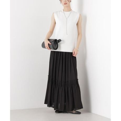 華やかさのある細かいギャザーディティールで切り替えたロングスカート。動くたびに、ふわっと揺れるシルエットが華やかな印象の一着。同素材展開のブラウスとのセットアップスタイルもおすすめです。
