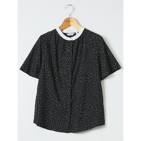 ドット柄 配色 バンドカラー 比翼 半袖 ブラウス