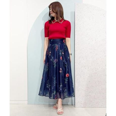 【エレガントな揺れ感のシアーボタニカルフラワースカート】【Point】・繊細なボタニカルフラワープリントが目を惹く、上品なスカート。・広がりすぎないフレアシルエットで、大人フェミニンな印象に仕上げました。・幅広のウエスト部分はすっきりと仕上げ、トップスインもきれいに決まります。・バックウエストはレースアップ仕様になっており、サイズ調整が可能。フィット感を高めながらスタイルアップも叶えます。・軽やかな素材感で、歩くたびにふんわりと揺れるシルエットが女性らしさを演出します。・ブラウス合わせで上品に、ニットやカットソーと合わせてデイリーにも活躍する一枚です。ケア方法:ドライクリーニング透け感:なし裏地:あり伸縮性:なし光沢感:なし生地の厚さ:薄手