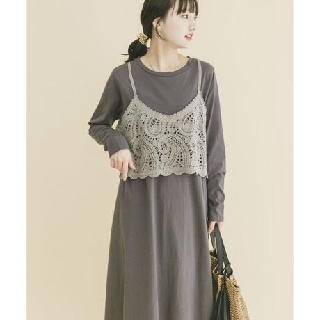 ナチュラルな雰囲気のかぎ針編みキャミと、着心地の良いカットワンピースがセットになったアイテム。重ねるだけでこなれたレイヤードスタイルが完成し、簡単にトレンド感のある着こなしが楽しめます。キャミはコーデのアクセントとして単体使いもでき、ワンピースは1枚でもさらっと着られる万能さが魅力。リラックス感と大人かわいさを兼ね備えた、デイリーに活躍するセットアイテムです。