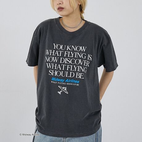 アメリカの航空会社「ミッドウェイ航空」の英文メッセージと飛行機グラフィックをフロントに大胆配置した、ストーリー性溢れる一枚。ピグメント染めのあとさらに加工をほどかすことで、くすんだチャコールグレーとレトロなフォントデザインが、古着のような風合いを演出。程よいゆとりのあるシルエットで、こなれ感たっぷりのカジュアルコーデが完成します。