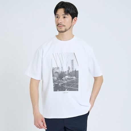 やややゆとりのあるシルエットに、モノトーンで海外の街並みを表現したフォトプリントを配置。