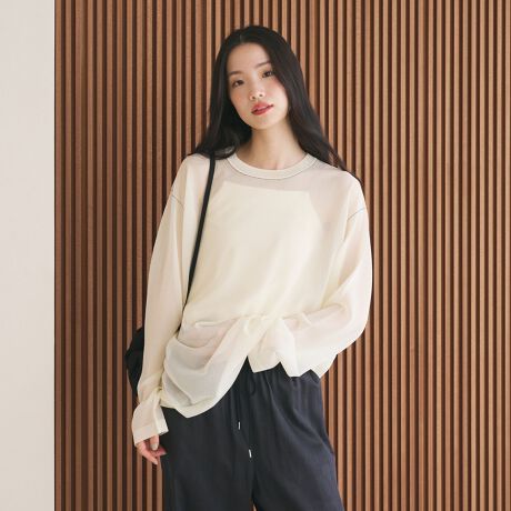 やわらかなムードの透けと落ち感がポイントになったニットプルオーバー。