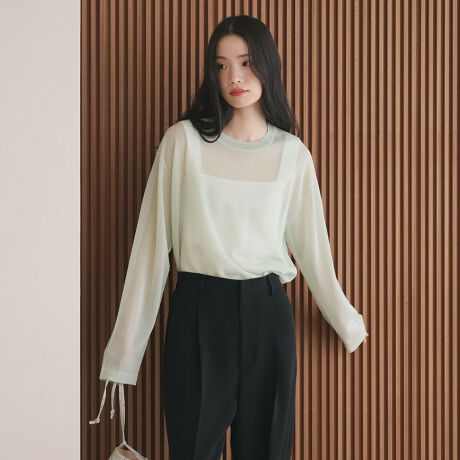 シアーな質感とさりげない配色ラインで着こなしにニュアンスをプラスするシアーニット