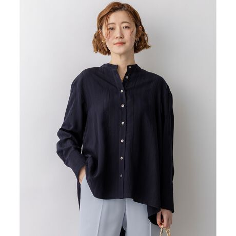 バックに大胆に重なったタックが印象的なシャツブラウスです。胸下から裾に向かって優雅に広がるフレアシルエットは、気になる体のラインを優しくカバーしてくれます。ヒップラインを自然にカバーしてくれる丈感で、安心感のある着心地も魅力です。前後の丈に差寸を多めにつけることで、着こなしにメリハリが生まれ、どの角度から見ても美しいシルエットが完成する、こだわりの一枚です。 シンプルなパンツと合わせるだけで洗練された大人のカジュアルスタイルが完成します。オフィスシーンでは、きれいめパンツやタイトスカートと合わせて上品な着こなしに。休日にはデニムやワイドパンツと合わせて、リラックス感のあるおしゃれをお楽しみいただけます。 カラーは、清潔感があり着回し力抜群のホワイト(#101)、顔色を明るく見せる爽やかなスカイブルー(#172)、知的で上品な印象を与えるネイビー(#175)の3色展開です。
