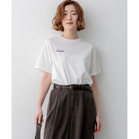 フロントの左胸には「A bientot(またね!)」、バックには大胆に「A un de ces guatre(また逢おうね!)」と、友人との別れ際に交わすラフで温かいメッセージをあしらったロゴTシャツです。印象的なバックロゴ刺繍がコーディネートのアクセントになり、一枚で着ても様になる着映えデザインに仕上げました。身体のラインを拾いすぎない、ややリラクシーなシルエットで、気負わずリラックスしてご着用いただけます。裾にはサイドスリットが入っており、前後差のあるヘムラインが腰回りを自然にカバーします。デニムを合わせたカジュアルなスタイリングはもちろん、ロングスカートと合わせて抜け感を出したフェミニンなコーディネートもおすすめ。大人の休日にぴったりの一枚です。カラーは、清潔感のあるホワイト(#001)、シックで大人っぽいブラック(#005)、トレンド感のあるブラウン(#030)、肌馴染みが良くナチュラルなベージュ(#033)の4色展開です。