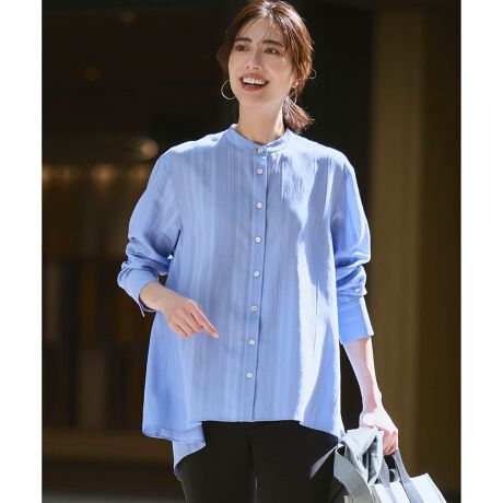 バックに大胆に重なったタックが印象的なシャツブラウスです。胸下から裾に向かって優雅に広がるフレアシルエットは、気になる体のラインを優しくカバーしてくれます。ヒップラインを自然にカバーしてくれる丈感で、安心感のある着心地も魅力です。前後の丈に差寸を多めにつけることで、着こなしにメリハリが生まれ、どの角度から見ても美しいシルエットが完成する、こだわりの一枚です。 シンプルなパンツと合わせるだけで洗練された大人のカジュアルスタイルが完成します。オフィスシーンでは、きれいめパンツやタイトスカートと合わせて上品な着こなしに。休日にはデニムやワイドパンツと合わせて、リラックス感のあるおしゃれをお楽しみいただけます。 カラーは、清潔感があり着回し力抜群のホワイト(#101)、顔色を明るく見せる爽やかなスカイブルー(#172)、知的で上品な印象を与えるネイビー(#175)の3色展開です。