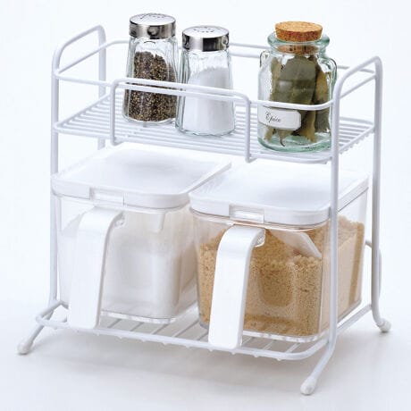 [型番:439369]【デザイン】●普段使いの調味料をすぐ手の届くところに収納できる調味料ラックです。●上段はワイヤー間隔が狭いので、小さな調味料ボトルも置くことができます。●下段には、砂糖や塩などの調味料ポットをすっきり置くことができます。【スペック】サイズ/約幅21×奥行15×高さ20cm重量/約445g内容量/1個材質/本体:鉄(エポキシ樹脂塗装)保護キャップ:塩化ビニル生産国/中国製耐荷重/上段・下段:約1.5kg