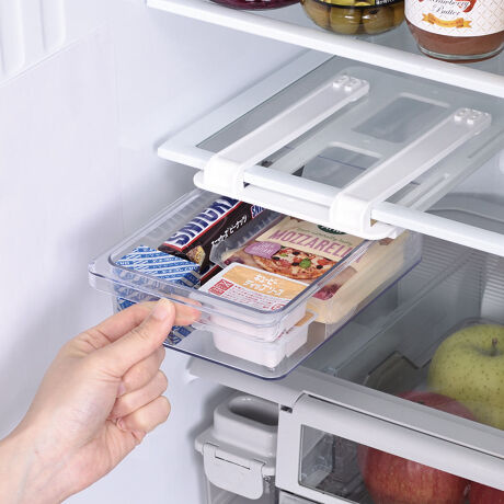 ●冷蔵庫の棚板に取り付けて使える引き出しです。
