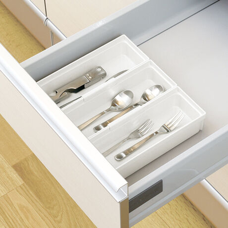 ●キッチンの引き出しの中をサイズ別に分けて、様々なカトラリーの定位置を作り美しく収納できます。