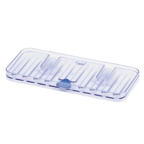 [型番:447380]【デザイン】●スッキリとしたデザインのアクリル製スポンジトレーです。●水抜き穴があり、シンクに水が流れる仕様です。●しっかりと固定出来る吸着盤付きです。【スペック】サイズ/約幅20×奥行8.5×高さ1.5cm重量/約76g内容量/1個材質/スポンジトレー:アクリル樹脂、吸着盤:塩化ビニル種類/クリア、ブルー生産国/日本製パーツ別耐熱温度/アクリル樹脂:80度