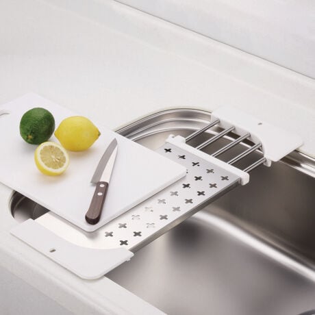 [型番:447386]【デザイン】●キッチンのスペースを活用出来るLサイズの調理台です。●錆びや汚れに強いステンレス製です。●シンクに合わせてぴったりフィットするスライド式です。●約43〜63cmのシンクに対応しています。【スペック】サイズ/幅18×奥行45.5〜69.5×高さ2cm重量/約441g内容量/1個材質/金属部:ステンレス鋼樹脂部:ABS樹脂パーツ別耐熱温度/樹脂部:80度耐荷重/2kg