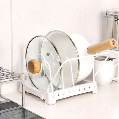 [型番:447435]【デザイン】●鍋やフライパンを引出し内でスッキリ収納できるラックです。●縦置き横置きどちらもOK!で便利にお使い頂けます。●仕切り部分は5本あります。●取っ手が上になる仕様になっています。【スペック】サイズ/約幅21.5×奥行23×高さ15.5cm重量/約346g内容量/1個材質/トレー:ポリプロピレンワイヤー:鉄(メラミン焼付け塗装)すべり止め:シリコーンゴム生産国/日本製