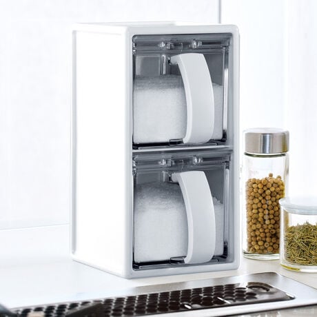 ●調味料ポットの容量はそれぞれ約640mlで、砂糖なら約440g、塩なら約760gを収納できます。フタの上部は大きく取り外しができるため、移し替えや補充も簡単です。