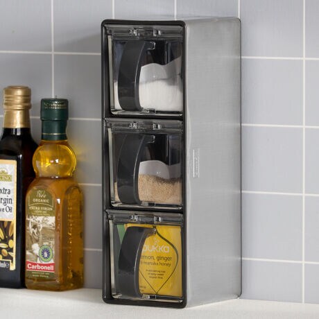 ●縦向きにも横向きにも置けるスタイリッシュなデザインで汚れにも強い、ステンレス製の調味料ストッカーです。