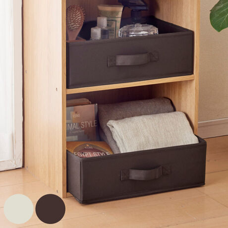 [型番:453827]【デザイン】●使いやすく整理整頓できるインナーボックス横型ハーフ 同色2個入りです。●カラーボックスの横幅に対応しています。●底板付きで丈夫な仕様です。●高い場所や低い場所からも取り出しやすい取っ手付きです。【スペック】サイズ/約幅38×奥行26×高さ12.5cm重量/約650g内容量/同色2個入り材質/本体:ポリエステル、ポリプロピレン芯材:厚紙種類/アイボリー、ブラウン原産国/中国組立状態/お客様組立品