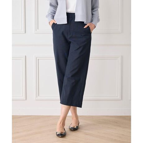 ■デザイン綿麻混のポリエステル素材を使用し、白や淡色でも透けにくく安心して着用いただけるクロップトパンツ。すっきりとしたシルエットにこだわりながら、程よいワイド感と軽やかなクロップト丈でバランスよく仕上げました。ウエストは前をフラットに、後ろはゴム仕様にすることで見た目の美しさと快適な穿き心地を両立。きれいめにもカジュアルにも合わせやすい、汎用性の高いアイテムです。■素材綿麻混のポリエステルオックス素材を使用。光の透過を抑えるポリマー原糸により、白や淡色でも透けにくく安心して着用いただけます。さらに、原糸構造の工夫によって優れた吸水・速乾性を実現。オックス特有の凹凸が生む清涼感と豊かな表情を備え、きちんと感と快適な着心地を兼ね備えた素材です。・水洗い可・ポケットあり・ウエストゴム・裏地なし■サンプル撮影商品画像の商品はサンプルです。実際の商品とはサイズや色味、素材、デザイン等の仕様が若干変更になる場合がございます。■カラーについては、可能な限り実際の商品に近いカラーで撮影をおこなっておりますが、照明の関係により実際の製品とは色味が違って見える場合があります。またパソコン・スマートフォンなどの環境により、若干製品と画像のカラーが異なる場合もございます。現物と画像のカラー差異については返品理由となりませんので、予めご了承ください。■サイズ表記はあくまで目安となります。
