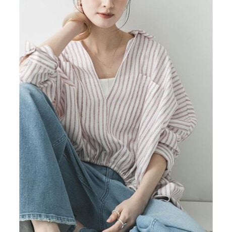 清涼感のある風合いと、裾のドロストデザインが抜け感を作るラミーレーヨンギャザーヘムシャツ。