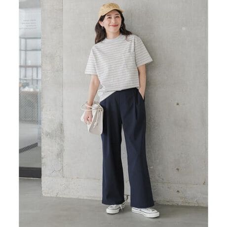 フロントにはタックデザインを施し、腰周りをすっきりと見せながら程よいゆとりで体型を拾いにくいシルエットに仕上げました。
