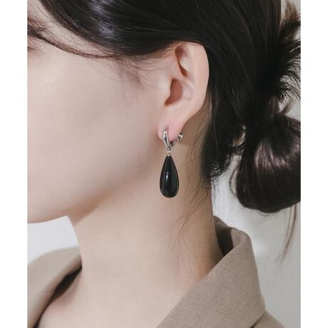 滑らかな光沢を放つブラックのドロップパーツが、知的な印象のイヤリング。