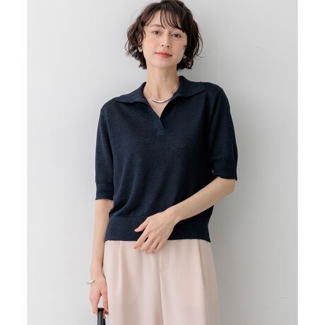 上質な麻素材の風合いを最大限に活かすため、ボタンなどの装飾をあえて削ぎ落とし、ミニマルでシックな印象に仕上げた大人のためのポロニットです。スキッパーデザインの襟元は、前立てを内側から少し縫い止めることで胸元が開き過ぎないように工夫し、インナーを気にせず安心してご着用いただけます。シンプルながらも洗練されたデザインは、一枚で着映えするアイテムです。 デニムと合わせた大人のカジュアルスタイルはもちろん、きれいめなスカートやスラックスと合わせた夏のきれいめコーディネートにも活躍します。カラーは、コーディネートのアクセントになる鮮やかなレッド(#010)、肌なじみが良くナチュラルな気品漂うベージュ(#033)、涼しげで爽やかなブルー(#070)、シックで知的な印象を与えるネイビー(#075)の4色展開です。