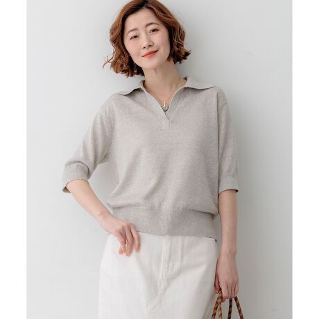 上質な麻素材の風合いを最大限に活かすため、ボタンなどの装飾をあえて削ぎ落とし、ミニマルでシックな印象に仕上げた大人のためのポロニットです。スキッパーデザインの襟元は、前立てを内側から少し縫い止めることで胸元が開き過ぎないように工夫し、インナーを気にせず安心してご着用いただけます。シンプルながらも洗練されたデザインは、一枚で着映えするアイテムです。 デニムと合わせた大人のカジュアルスタイルはもちろん、きれいめなスカートやスラックスと合わせた夏のきれいめコーディネートにも活躍します。カラーは、コーディネートのアクセントになる鮮やかなレッド(#010)、肌なじみが良くナチュラルな気品漂うベージュ(#033)、涼しげで爽やかなブルー(#070)、シックで知的な印象を与えるネイビー(#075)の4色展開です。