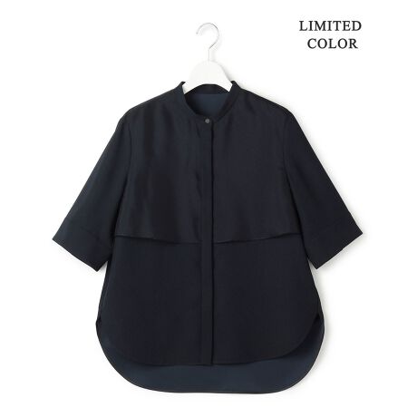 ■デザインすっきりとしたバンドカラーと、程よくゆったりとしたサイズ感がポイントのシャツブラウスです。胸元には別布のシアー素材を使用したフライヨークをあしらい、さりげなくトレンド感のあるアクセントをプラスしました。前後差のあるヘムラインが軽やかな動きを演出し、一枚着としてはもちろん、フロントを開けて羽織りとしてもサマになるデザインです。同シリーズのパンツやスカートとのセットアップでの着用もおすすめです。