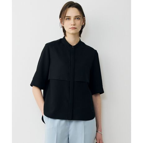 ■デザインすっきりとしたバンドカラーと、程よくゆったりとしたサイズ感がポイントのシャツブラウスです。胸元には別布のシアー素材を使用したフライヨークをあしらい、さりげなくトレンド感のあるアクセントをプラスしました。前後差のあるヘムラインが軽やかな動きを演出し、一枚着としてはもちろん、フロントを開けて羽織りとしてもサマになるデザインです。同シリーズのパンツやスカートとのセットアップでの着用もおすすめです。