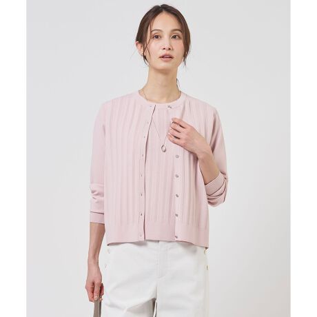 ■デザイン清涼感のあるタッチと、前身頃に施された繊細な編み柄がポイントのクルーネックカーディガン。きらりと光るJ.PRESSのロゴ入りメタル釦が、トラッドで洗練されたアクセントをプラス。マットな艶感としなやかな着心地を兼ね備えており、ジャケットのインナーとしてビジネスシーンにはもちろん、ワンピースに羽織って食事会やお出かけなど、幅広いシーンで活躍します。同素材のニットと合わせたアンサンブルスタイルもおすすめ。上品なデザインで、大人の女性にふさわしいきちんと感と華やかさを両立した1着です。カラーは、女性らしさを引き立てるのピンク(#012)、やわらかく肌なじみの良いライトベージュ(#033)、爽やかで洗練された印象のサックスブルー(#073)、シーンレスに活躍するネイビー(#075)の4色展開です。