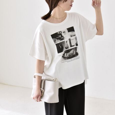 《予約》quaranciel:〈接触冷感/汗染み防止加工/洗濯機可能〉CAT プリント TEE