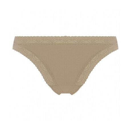 滑らかな生地を使用したバックスタイルがTの字に見えるTバックタイプのショーツ。ウエストと脚口にはモダンな細レースを施し、服にラインがひびきにくいデザインです。