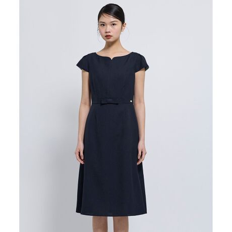 落ち着いた印象の中に、さりげない華やかさを忍ばせたドレスです。首元は緩やかなカーブを描くハートネックラインで、デコルテを上品に見せながら、女性らしい柔らかさを演出します。肩にほんのり丸みを持たせたコンパクトなスリーブが、腕まわりをすっきりと見せつつ、全体にクラシカルなムードをプラス。ウエスト部分には同素材のベルトディテールをあしらい、視線を自然に集めることでスタイルアップ効果も叶えています。