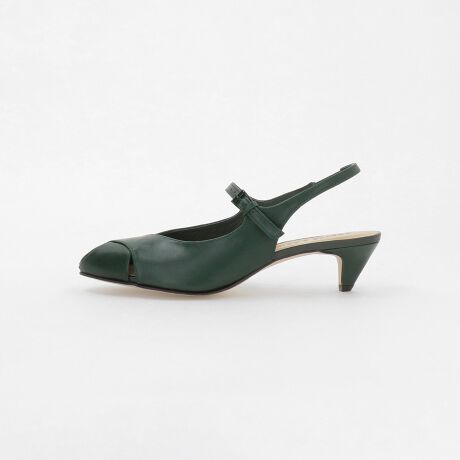 つま先が少し開いたピープトゥのバックベルトパンプス。