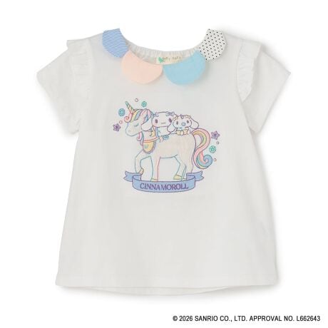 ふわふわなユニコーンに乗ったサンリオキャラクターズが可愛らしいTシャツです。オフホワイトにはシナモロールとミルク、ピンクにはマイメロディ、ラベンダーにはクロミのアップリケをデザイン。素材違いのカラフルな衿もアクセントになり、一枚で主役級のスタイリングが完成します。後ろの衿ぐりはゴム仕様のため、お着替えしやすいのも魅力です。内側にお名前を記入できるタグがついています。