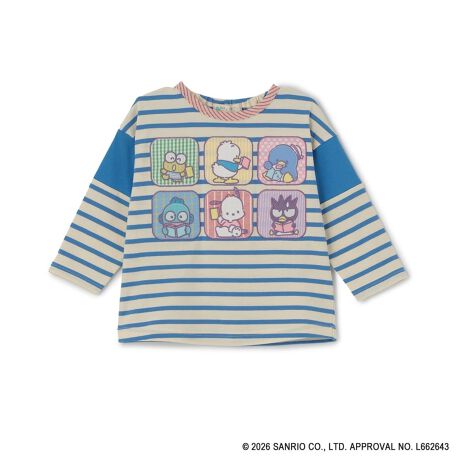 サンリオキャラクターズのはぴだんぶいをデザインしたTシャツです。カラフルに並んだパステル調のアップリケ刺しゅうが可愛らしい一枚。ドロップショルダーでゆったりとしたシルエットに仕上げています。後ろの衿ぐりはゴム仕様のため、お着替えしやすいのも魅力です。内側にお名前を記入できるタグがついています。