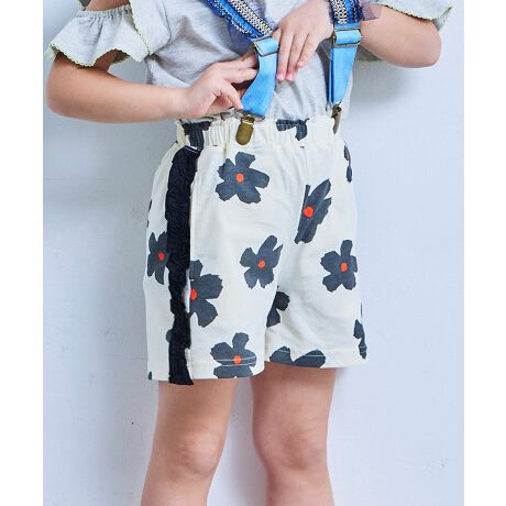 存在感のある総柄ボディに、サイドのサテンフリルをあしらったショートパンツです。