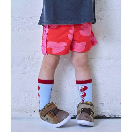 存在感のある総柄ボディに、サイドのサテンフリルをあしらったショートパンツです。