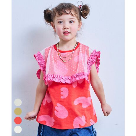 やわらかなチュール素材を重ねたデザインに、カラー配色のフリルをあしらったノースリーブカットソーです。