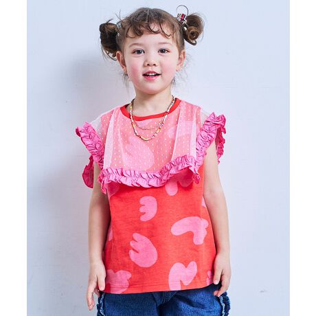 やわらかなチュール素材を重ねたデザインに、カラー配色のフリルをあしらったノースリーブカットソーです。