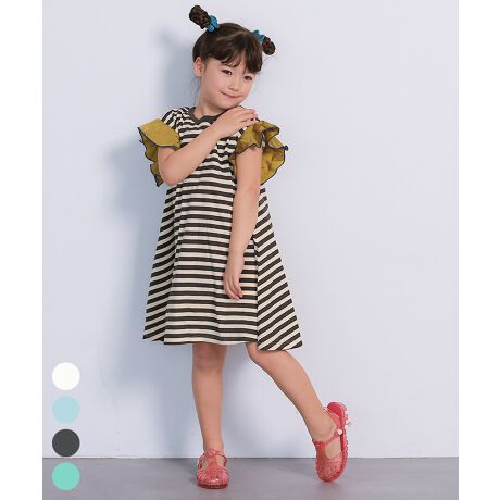 ドット柄とボーダー柄のアソート展開に、配色フリルスリーブを組み合わせたワンピースです。