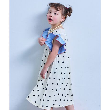 ドット柄とボーダー柄のアソート展開に、配色フリルスリーブを組み合わせたワンピースです。
