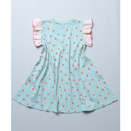 ドット柄とボーダー柄のアソート展開に、配色フリルスリーブを組み合わせたワンピースです。