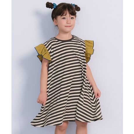 ドット柄とボーダー柄のアソート展開に、配色フリルスリーブを組み合わせたワンピースです。