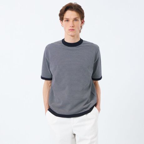 ショートスリーブのセミモックネックニット。ジャケットのインナーとしてはもちろん、単調になりがちな夏場のコーディネートに、大人っぽい上品さを添える一枚です。