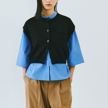 クロップド丈がシャツとのレイヤードをバランス良く見せ、スタイリングを軽やかに仕上げます。