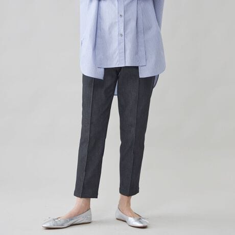 【デニム見えなのにクリーン。脚をまっすぐ美しく見せるデニム調の細身スラックス】