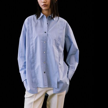 【オンオフ使える、斜め切り替えデザインストライプシャツ】